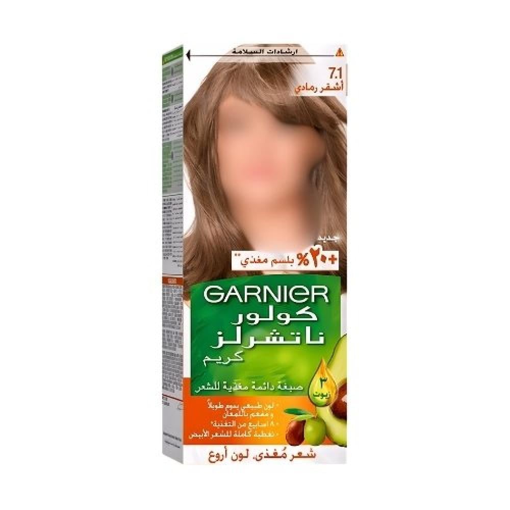 صبغة كولور ناتشرلز من غارنييه أشقر رمادي رقم 7.1 تمنحك لونًا طبيعيًا باردًا، تغطية مثالية للشيب، ولمعانًا يدوم طويلًا.